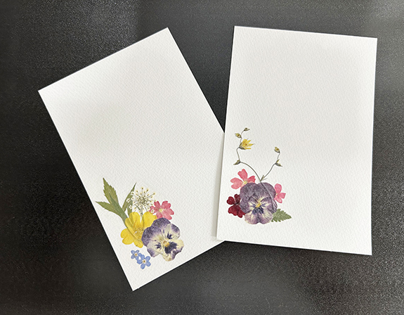 押し花ポチ袋(写真 左) こんなきれいな袋でお年玉を もらうとうれしいですね! ●縦7.0cm×高さ12.2cm 1枚 150円 押し花封筒(写真 右) 習い事の月謝を入れてお渡しする 「謝礼袋」としても人気。 ●縦9.2cm×高さ17.2cm 1枚 250円 |