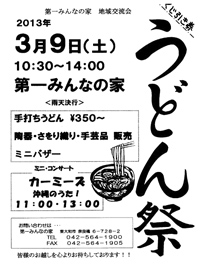 第一みんなの家では、今年も恒例の「うどん祭」を3月9日(土)に開催します。 当日は、ボランティアさんに手伝っていただいて打った手打ちうどん(一杯350円)のほかに、陶器やさをり織り、手芸品なども販売。外ではミニバザーも行います。 また、今年のミニコンサートは「カーミーズ」のみなさんをお招きして沖縄のうたを楽しみます。 どうぞお誘いあわせのうえお越しください。 「第一みんなの家地域交流会 うどん祭」 日時 2013年3月9日(土) 10:30〜14:00(雨天決行) (ミニコンサート 1回目11:00、2回目13:00) 場所 第一みんなの家 お問い合わせは第一みんなの家(042-564-1900)へ。 |