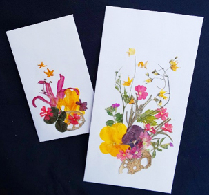 押し花ポチ袋(写真 左) こんなきれいな袋でお年玉を もらうとうれしいですね! ●縦7.0cm×高さ12.2cm 1枚 150円 押し花封筒(写真 右) 習い事の月謝を入れてお渡しする 「謝礼袋」としても人気。 ●縦9.2cm×高さ17.2cm 1枚 250円 |
