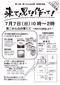 今年も第二みんなの家の一大イベント、地域交流会が近づいてきました。 体験コーナーの陶芸体験は1回800円 湯のみ、小鉢、茶碗など自由につくっていただけます。 きれいなお花を使っての押し花体験は、 うちわ(大500円 中400円 小300円) クリアファイル300円 どちらも楽しくて、お子様の夏休みの自由制作にうってつけの企画です。わからないところなどは、通所者が優しく丁寧に教えます。 また、国産の鶏もも肉のやきとり、暑い日にはもってこいのかき氷やアイスコーヒー、手作り無添加のジャム、アンダーギー、みんなのあめなども販売します。 そして、掘り出し物がいっぱいのバザーや日頃、私たちが気持ちを込めて作っている作品もたくさん並びますので是非みなさんいらして下さい。 7月7日(日)10時〜14時、第二みんなの家にてみなさんをお待ちしています! みんなで来て、みんなで見て、みんなで作ってください! |