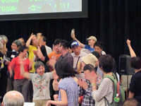 5月10日(金)国立オリンピック記念青少年総合センターで「きょうされん東京支部2013年度東京大会」が開催されました。 みんなの家からも、各作業所から利用者、職員、ささえる会から総勢20名が代表として参加しました。 午前中の全大会では、東日本大震災で被災した障害のある人が、どんな被害をうけたのか記録したドキュメンタリー映画「生命(いのち)のことづけ〜死亡率2倍障害のある人たちの3.11」と、宮城県にある共同作業所「きらら女川」の再建の様子をみました。 非常時に障害ある人たちが、どれだけ不安な思いでいたか、当事者として、関係者として真剣に見入りました。 そのあとの利用者部会「きづな会企画」では、「客席からも前にどうぞ」の呼びかけに、第二みんなの家の利用者さんが参加して、客席にいた残りの利用者さんも、大いに盛り上がりました。 午後からは分科会。 みんなの家からは、「うたって☆おどってワクワク企画♪」、「みんなが主人公であることを考えよう」、映画「ゆずり葉」の3つに分かれて参加しました。 思い切りうたって踊ったグループ、前の日から原稿などを用意して、作業所や自治会の様子を伝えてきたグループ、映画を通して聴覚障害がある人の苦労を知り、涙したグループ・・・ 過ごした時間はそれぞれでしたが「楽しかった」「行ってよかった」という感想がきかれました。 翌日の特別講演と総会には、職員のみで参加。 障害者制度改革や障害者権利条約批准についてなど学習し、名称が変わるばかりで内容に変化がない法制度の様子に、ますます障害ある人の声を伝えていかなければと、考えさせられた1日でした。 |