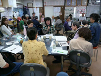「きづな会企画」でステージに立ちました! 花びら型の布に被災者へのメッセージを 分科会の様子 |
