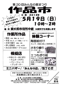 5月19日(日)、午前10時から午後2時まで、東大和市市役所中庭にて、「みんなの家まつり〜作品市〜」を開催します。 利用者が主体となった実行委員を中心に、「第一、第二、第三みんなの家」全体で力を合わせて準備を進めています。 魅力は、陶器の絵付け体験、さをり織りのコースター作り体験、てすきはがきのエコちぎり絵体験コーナーです。 作業所の作品も品数を豊富にして販売します。その他、バザー、やきとり、おにぎり、チヂミ、などの模擬店も色々あります。 土建組合さんのご協力で包丁とぎもおこないます。みなさま、ご家族やお友達お誘い合わせてぜひお越しくださいませ。 昨年大好評だった、来場者全員のくじ引きもあります。 今年も、当たりが出たら、作品市でお買い物ができる金券をプレゼントします。 ふるってご参加ください。 |